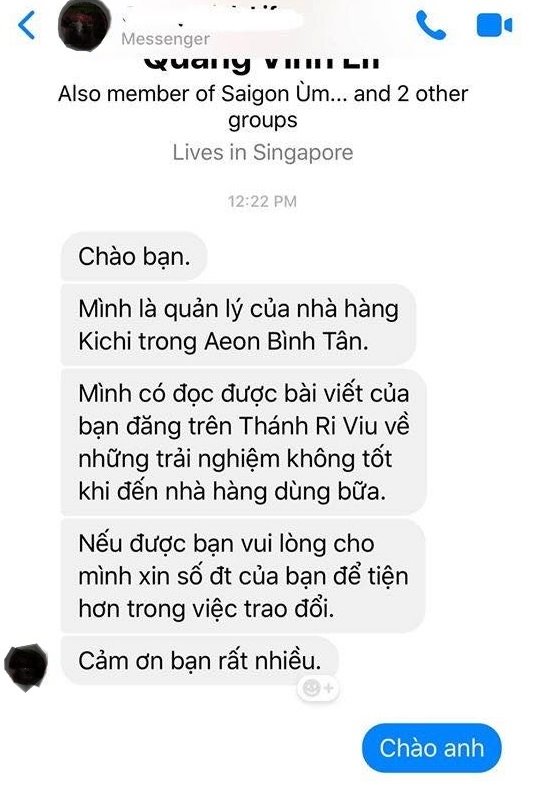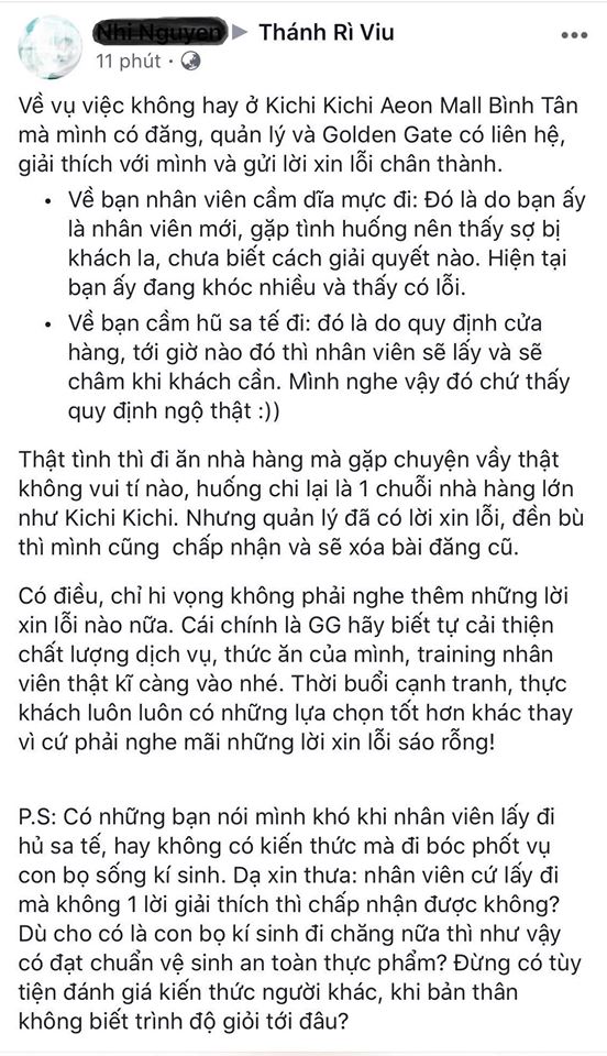 Cũng theo phản ánh từ N.N, chiều cùng ngày quản lý của nhà hàng Kichi Kichi tại Aeon Bình Tân đã liên hệ giải thích và gửi lời xin lỗi nhưng chỉ là tin nhắn và điện thoại.