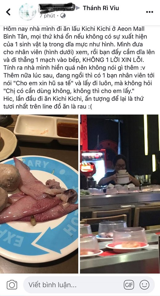 Theo phản ánh, vào chiều ngày 5/12, khách hàng có tài khoản mạng xã hội N.N cùng gia đình mình đến ăn uống tại nhà hàng lẩu băng chuyền Kichi Kichi tại Aeon Maill Bình Tân. Mọi việc vẫn diễn ra bình thường cho đến khi mọi người phát hiện trong đĩa hải sản do nhân viên nhà hàng phục vụ có sinh vật lạ đang ngo ngoe trong đĩa mực tươi trông giống con giòi.