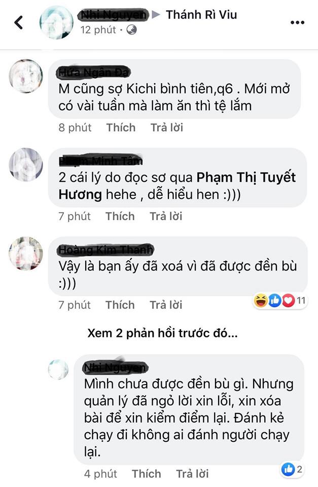 “Thật tình thì khi ăn nhà hàng mà gặp chuyện vầy thật không vui tí nào, huống chi là một chuỗi nhà hàng lớn như Kichi Kichi. Nhưng quản lý đã có lời xin lỗi, ngỏ ý đền bù thì mình cũng chấp nhận cho sự chân thành và sẽ xóa bài đăng cũ” – Khách hàng có tài khoản N.N chia sẻ trên FanFage “Thánh Rì Viu” Tuy vậy trên mạng vẫn còn vô số bình luận tỏ ra quan ngại cho thực khách đã từng và sắp chọn Kichi Kichi là nơi ăn uống cho mình và gia đình, bạn bè.