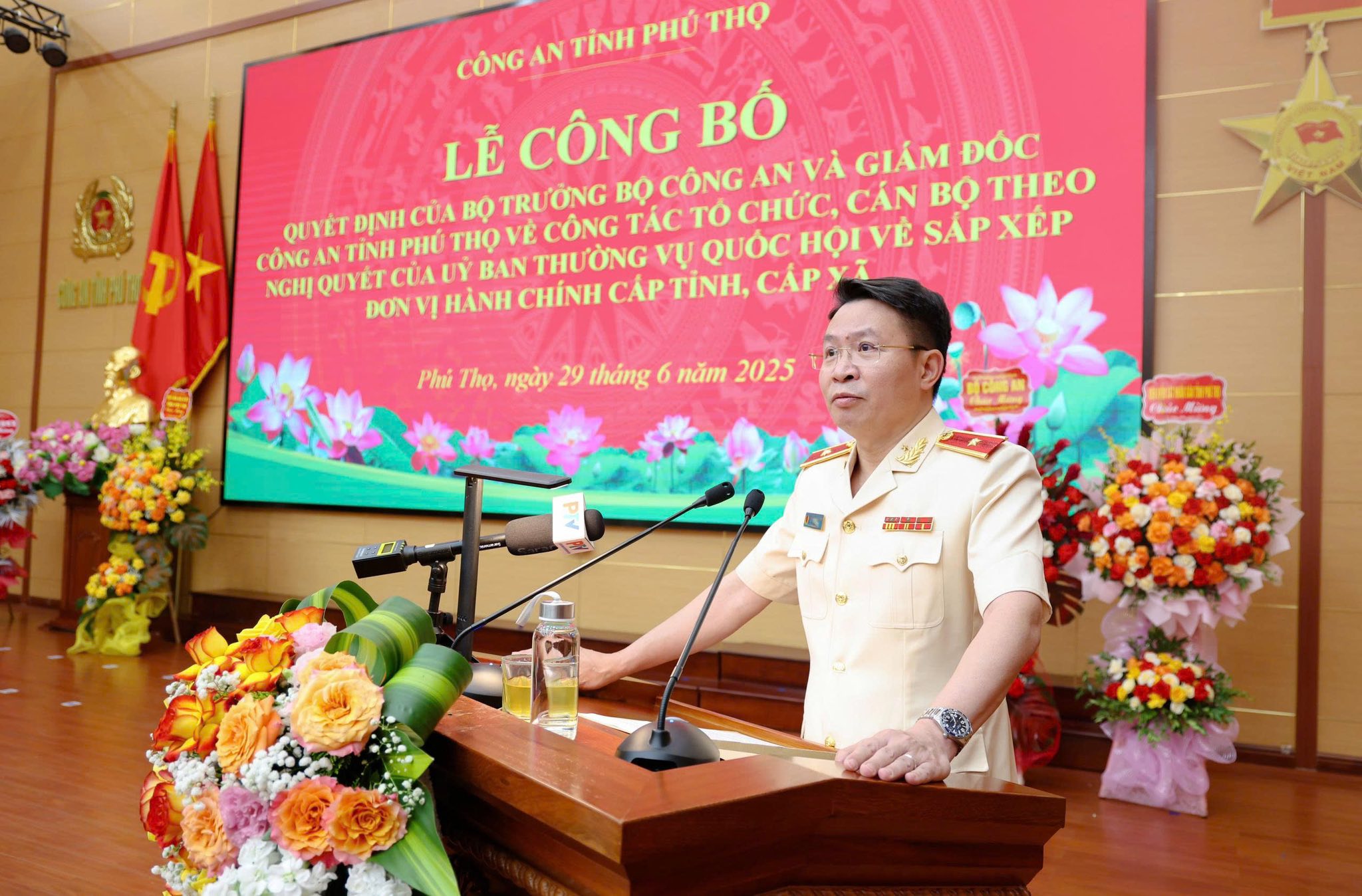 Các công bố tại buổi lễ gồm: công bố quyết định của Bộ trưởng Bộ Công an về việc thành lập 15 Công an phường, 133 Công an xã thuộc Công an tỉnh Phú Thọ sau sáp nhập; công bố Quyết định của Giám đốc Công an tỉnh Phú Thọ về triển khai tổ chức bộ máy của công an cấp xã; công bố và trao Quyết định của Giám đốc Công an tỉnh về bố trí cán bộ công tác tại các phòng thuộc Công an tỉnh Phú Thọ sau sáp nhập, trong đó bố trí 29 đồng chí Trưởng phòng; Công bố và trao quyết định của Giám đốc Công an tỉnh Phú Thọ cho 148 đồng chí Trưởng công an cấp xã và Trưởng đồn Công an KCN Bá Thiện.