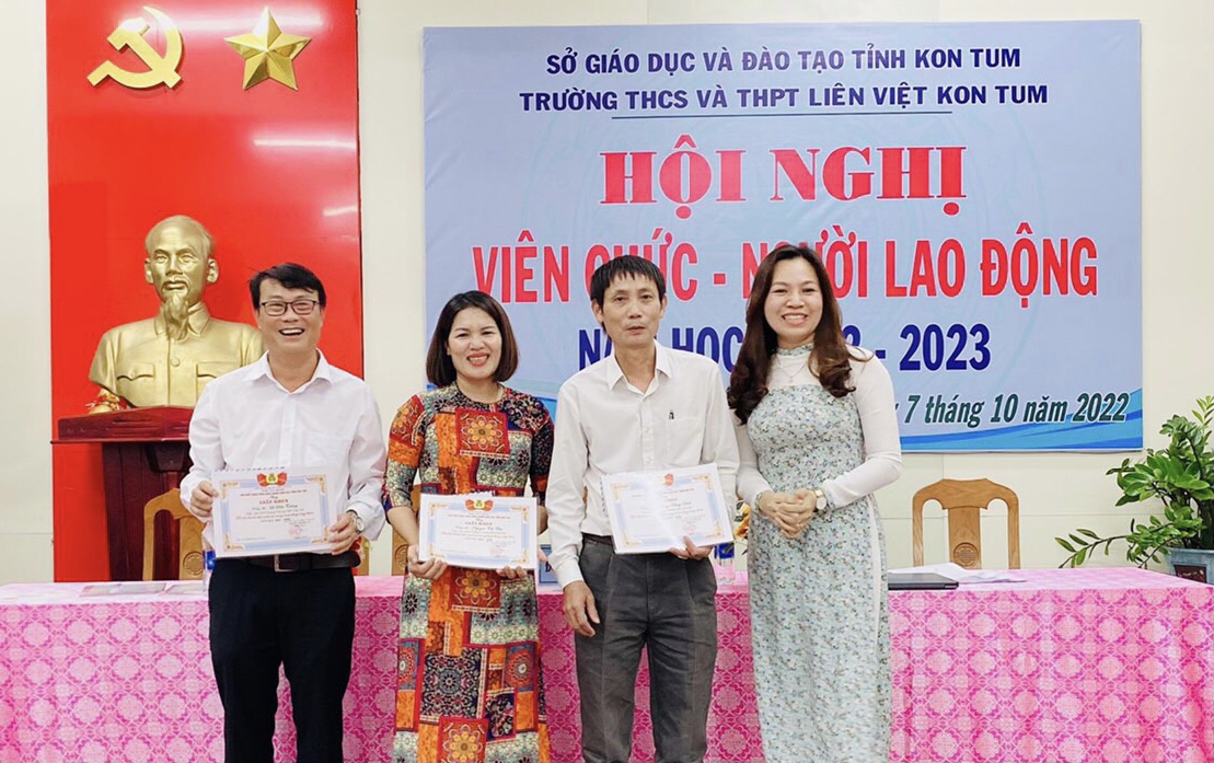 Thầy giáo Lê Đắc Tường (ngoài cùng bên trái) nhận khen thưởng của nhà trường.