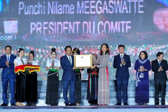 Bà Pauline Tamesis - Điều phối viên thường trú Liên hợp quốc tại Việt Nam, đại diện cho UNESCO trao bằng của UNESCO công nhận "Nghệ thuật Xòe Thái" là Di sản văn hóa phi vật thể đại diện của nhân loại cho đại diện Bộ trưởng Bộ Văn hóa-Thể thao và Du lịch. (Ảnh: VGP)
