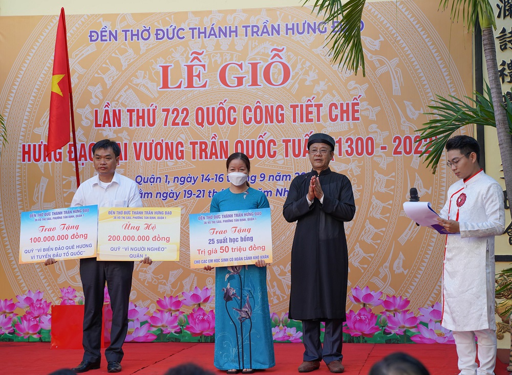 Tại buổi lễ, Ban Quản lý Đền thờ Đức Thánh Trần Hưng Đạo cũng trao tặng 100 triệu đồng ủng hộ Quỹ vì biển đảo quê hương – vì tuyến đầu Tổ quốc, tặng 200 triệu đồng cho quỹ vì người nghèo cho UBMTTQVN Quận 1 và 50 triệu đồng học bổng cho các em học sinh nghèo có hoàn cảnh khó khăn nhân dịp năm học mới.