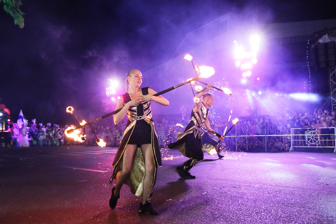 Điều bất ngờ lớn nhất trong đêm thứ 5 của Lễ hội Carnival đường phố DIFF 2019 chính là màn múa lửa vô cùng điệu nghệ. Những đốm lửa xoay chuyển đầy ma thuật theo sự chuyển động của cơ thể, ánh sáng từ cây pháo hoa trên tay của các nghệ sỹ tạo nên những vòng xoay lấp lánh ảo diệu. Khán giả trầm trồ không ngớt, bởi thực sự, nếu không tới rạp xiếc, có lẽ hiếm khi nào họ được xem một màn trình diễn nghệ thuật múa lửa ngoạn mục đến thế trên phố đêm.