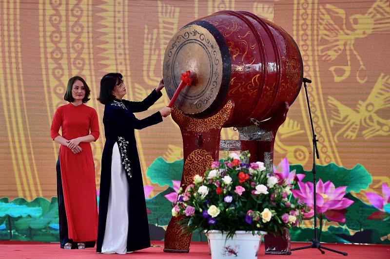 Phó Chủ tịch nước Đặng Thị Ngọc Thịnh đánh trống khai hội đền Hai Bà Trưng. Ảnh: VGP/Nhật Bắc
