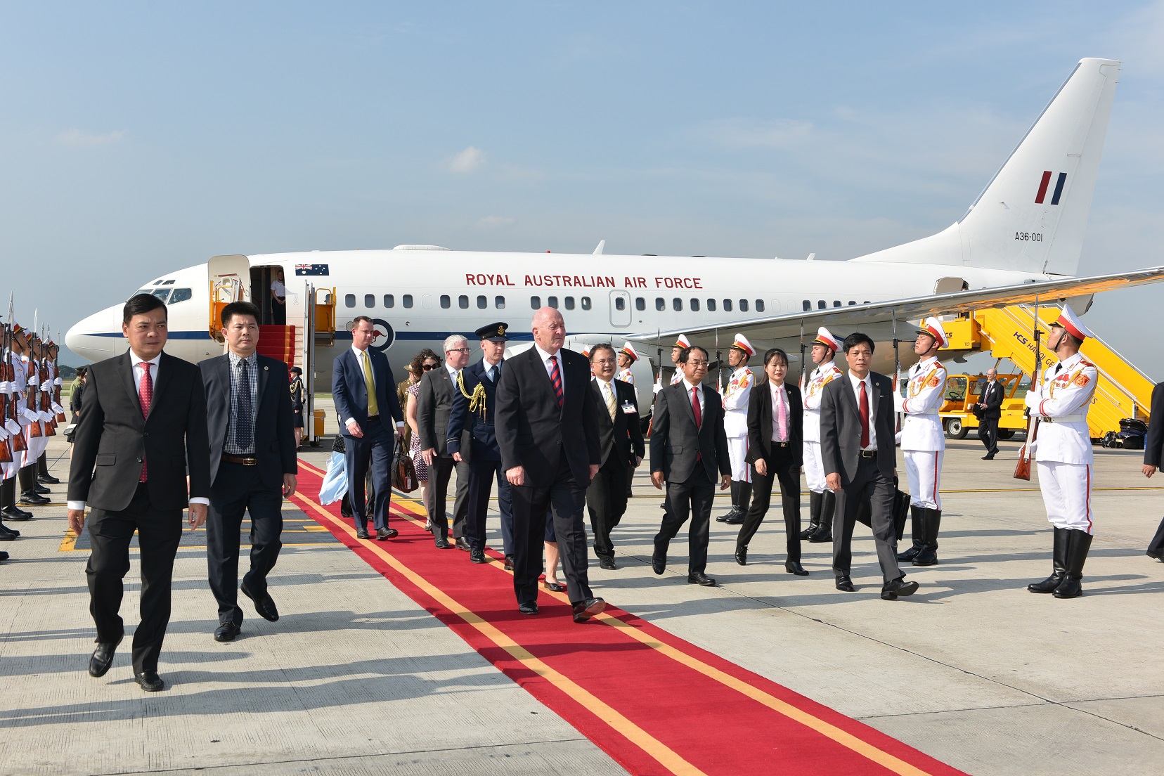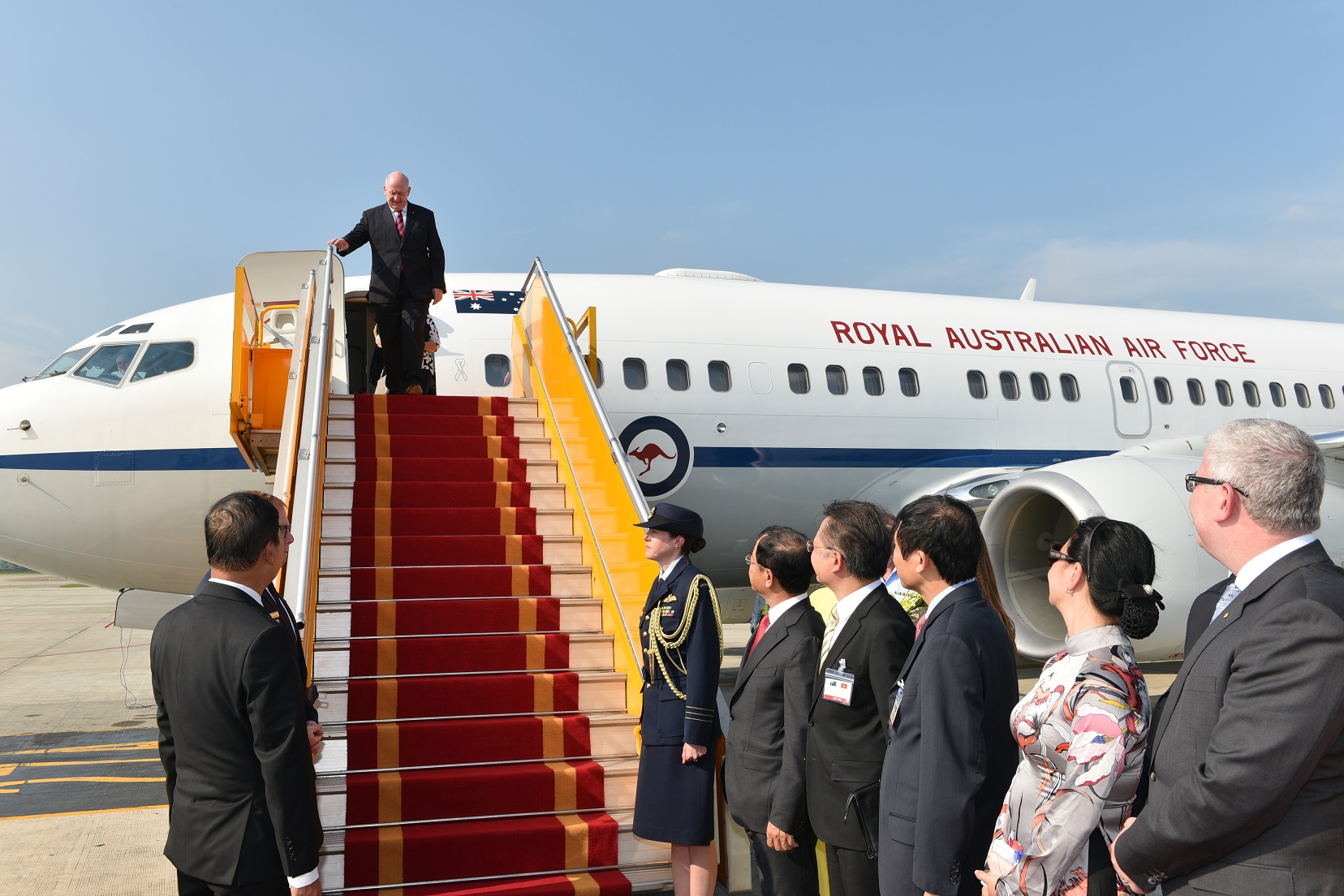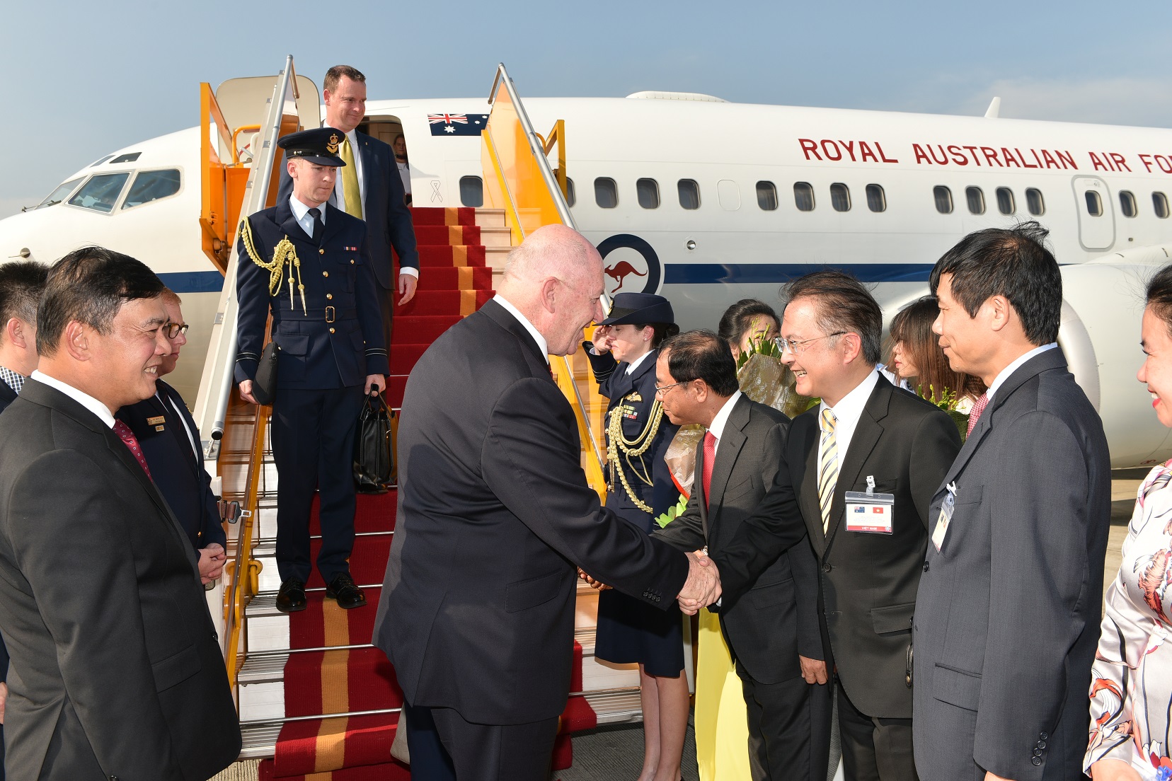 Toàn quyền Australia Ngài Peter Cosgrove rời phi cơ chuẩn bị cho nghi lễ tiếp đón