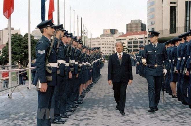 | Hình ảnh về lễ đón Tổng Bí thư Đỗ Mười trong chuyến thăm chính thức New Zealand (tháng 7/1995). (Ảnh: Xuân Lâm/TTXVN) |