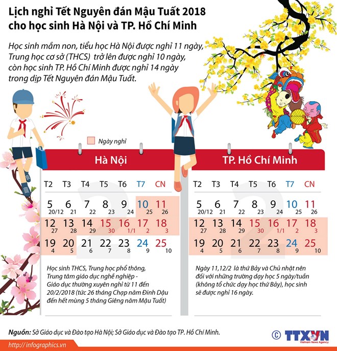 Học sinh mầm non, tiểu học Hà Nội được nghỉ 11 ngày, Trung học cơ sở trở lên được nghỉ 10 ngày, còn học sinh Thành phố Hồ Chí Minh được nghỉ 14 ngày trong dịp Tết Nguyên đán Mậu Tuất./.