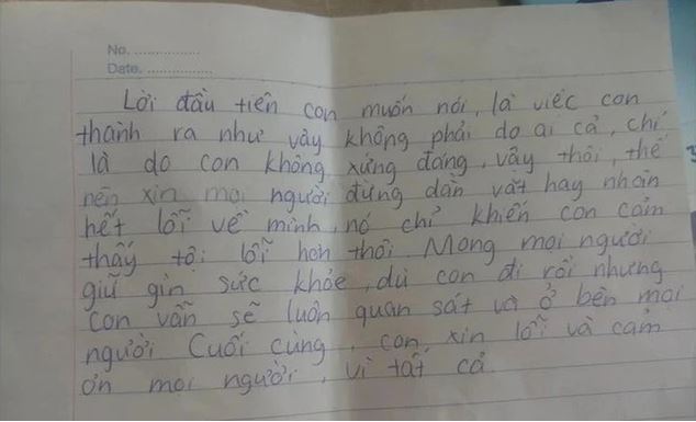 Báo Dân Trí trích đăng bức thư như sau: "Lời đầu tiên con muốn nói là việc con thành ra như vậy không phải do ai cả, chỉ là do con không xứng đáng, vậy thôi. Thế nên xin mọi người đừng dằn vặt hay nhận hết lỗi về mình, nó chỉ khiến con cảm thấy tội lỗi hơn thôi.