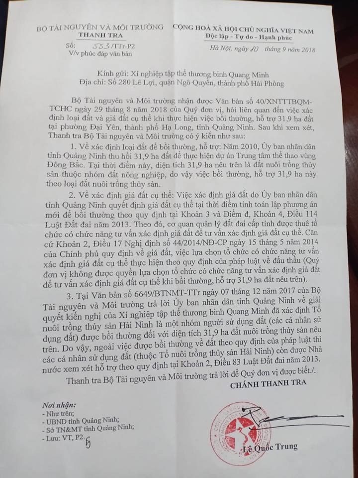 3. Tại văn bản số 6649/BTNMT-TTr ngày 7 tháng 12 năm 2017 của Bộ Tài nguyên và Môi Trường trả lời UNBD tỉnh Quảng Ninh về giải quyết kiến nghị của Xí nghiệp tập thể thương binh Quang Minh đã xác định Tổ nuôi trồng thủy hải sản Hải Ninh là một nhóm người sử dụng đất (các cá nhân sử dụng đất) được bồi thường đối với diện tích 31,9 ha đất nuôi trồng thủy hải sản nêu trên. Do vậy, ngoài việc được bồi thường về đất theo quy định của pháp luật thì các cá nhân sử dụng đất ( thuộc Tổ nuôi trồng thủy sản Hải Minh) còn được Nhà nước xem xét hỗ trợ theo quy định tại Khoản 2, điều 83 Luật đất đai 2013”.