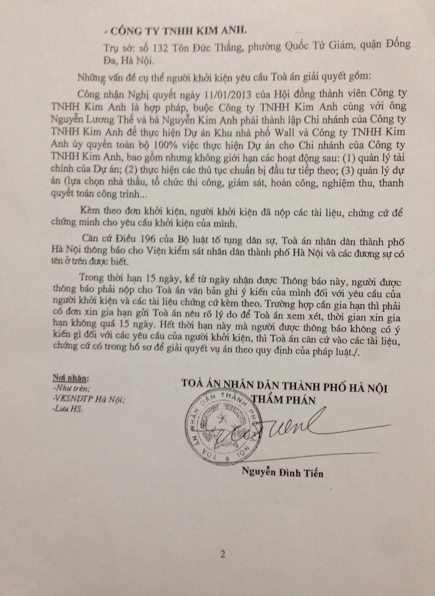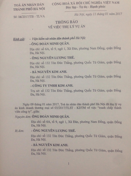 Thông báo của TAND Hà Nội nêu rõ, ngày 09/01/2017, TAND Hà Nội đã thụ lý vụ án kinh doanh thương mại số 03/2017/TLST-KDTM về việc “tranh chấp thành viên công ty”, giữa nguyên đơn là ông Đoàn Minh Quân; bị đơn là vợ, chồng ông Nguyễn Lương Thế, bà Nguyễn Kim Anh và Công ty TNHH Kim Anh có trụ sở tại số 132 Tôn Đức Thắng, phường Quốc Tử Giám, quận Đống Đa, Hà Nội.