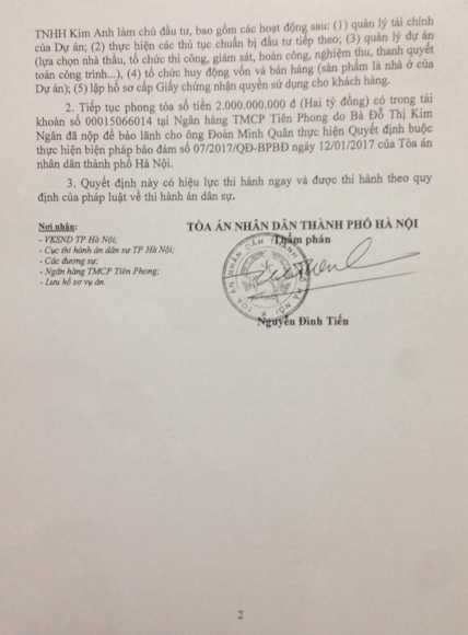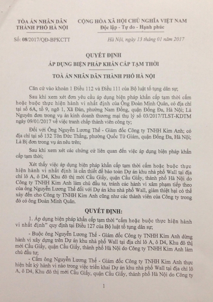 Ngay sau khi thụ lý vụ án, TAND Hà Nội đã áp dụng biện pháp khẩn cấp tạm thời “cấm hoặc buộc thực hiện hành vi nhất định” quy định tại Điều 127 Bộ luật Tố tụng dân sự là buộc ông Nguyễn Lương Thế - Giám đốc Công ty TNHH Kim Anh dừng hành vi xây dựng trên Dự án khu nhà phố Wall; đồng thời cấm ông Thế thực hiện bất cứ hành vi nào trong việc triển khai dự án do Công ty TNHH Kim Anh làm chủ đầu tư, bao gồm các hoạt động: quản lý tài chính của dự án; thực hiện các thủ tục chuẩn bị đầu tư tiếp theo; quản lý dự án (lựa chọn nhà thầu, tổ chức thi công, giám sát, hoàn công, nghiệm thu, thanh quyết toán công trình…); tổ chức huy động vốn và bán hàng; lập hồ sơ cấp Giấy chứng nhận quyền sử dụng cho khách hàng.
