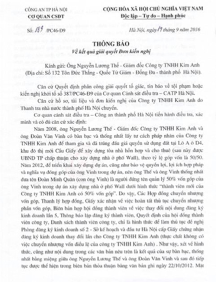Sau khi có kết luận của cơ quan Bộ Công an và Công an thành phố Hà Nội là “Chưa đủ căn cứ cơ sở kết luận hồ sơ giả mạo”, Sở Kế hoạch và Đầu tư cũng đã tham khảo ý kiến của nhiều cơ quan theo chức năng như: Phòng An ninh kinh tế (PA81); Cục CSĐT tội phạm về kinh tế và tham nhũng (C46) - Bộ Công an; Thanh tra Chính phủ; Thanh tra Bộ Kế hoạch và Đầu tư; Cục Quản lý đăng ký kinh doanh. Phòng ĐKKD số 2 và Sở Kế hoạch và Đầu tư lần lượt ban hành quyết định giải quyết khiếu lại lần 1 (ngày 21/10/2015) và Quyết định giải quyết khiếu nại lần 2 (ngày 25/01/2016) với cùng nội dung: “Nội dung khiếu nại và đề nghị thu hồi ĐKKD lần thứ 5 của Công ty TNHH Kim Anh tại thời điểm này là chưa đủ căn cứ pháp lý để thực hiện”.