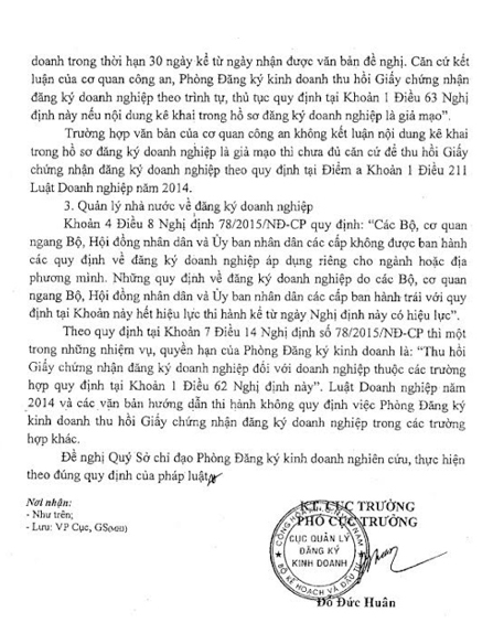 Liên quan đến vụ việc này, Cục Quản lý đăng ký kinh doanh (Bộ KH&ĐT) đã có văn bản trả lời chính thức số 294/ĐKKD-GS ngày 20/12/2016 và đề nghị Sở KH&ĐT Hà Nội thực hiện đúng theo quy định của pháp luật.