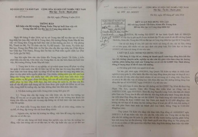 Sau khi thành lập, Trung tâm Hỗ trợ đào tạo và Cung ứng nhân lực được Bộ GD&ĐT bố trí trụ sở tại số 14 đường Lê Thánh Tông (quận Hoàn Kiếm, TP Hà Nội). Theo phản ánh của bạn đọc (là những cán bộ đang làm việc tại đơn vị này), ngay sau khi được Bộ trưởng Phạm Vũ Luận giao phụ trách Trung tâm (tháng 8/2015), ông Quách Tất Kiên cùng với kế toán trưởng Lò Thị Dung đã tổ chức, chỉ đạo lập chứng từ khống để rút ruột tiền nhà nước. Cụ thể như: ngày 19/8/2015, ông Kiên ký hợp đồng với Sở GD&ĐT Tây Ninh (số 1639/HĐĐT) để đào tạo bồi dưỡng chuyên môn, nghiệp vụ cho 435 cán bộ, giáo viên làm công tác hướng nghiệp, phân luồng học sinh sau trung học cơ sở. Tổng kinh phí từ ngân sách nhà nước phải trả cho hợp đồng này là 270,435 triệu đồng.