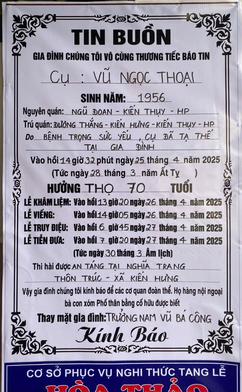 Nhận được tin cụ Vũ Ngọc Thoại là thân phụ ông Vũ Định - Cán bộ Cục An ninh đối ngoại (Bộ Công an) đã tạ thế vào hồi 14h32’ ngày 25/04/2025 (tức ngày 28/3 năm Ất Tỵ), tại Đường Thắng, Kiến Hưng, Kiến Thụy, Hải Phòng. Ban biên tập và cán bộ, phóng viên của Tạp chí điện tử Hòa nhập gửi tới ông Vũ Định và gia quyến lời chia buồn sâu sắc.