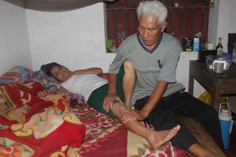 Vợ ông Lịch bị gãy xương bánh chè không có tiền mổ. Ông ngồi cạnh xoa chân cho vợ bớt đau.