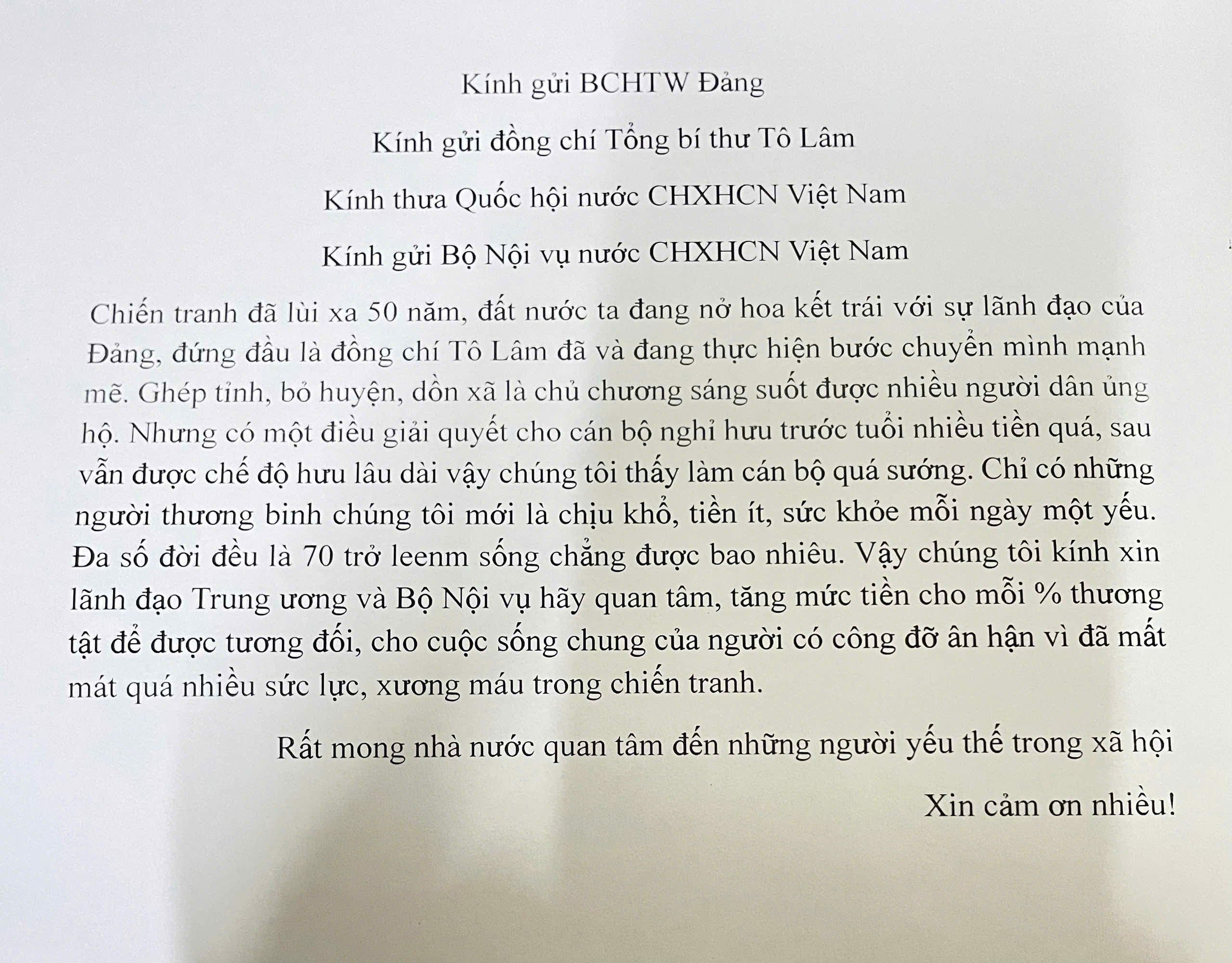 “Chỉ có những người thương binh chúng tôi mới là chịu khổ, tiền ít, sức khỏe mỗi ngày một yếu… Vậy chúng tôi kính xin lãnh đạo Trung ương và Bộ Nội vụ hãy quan tâm, tăng mức tiền cho mỗi % thương tật để được tương đối, cho cuộc sống chung của người có công đỡ ân hận vì đã mất mát quá nhiều sức lực, xương máu trong chiến tranh.”