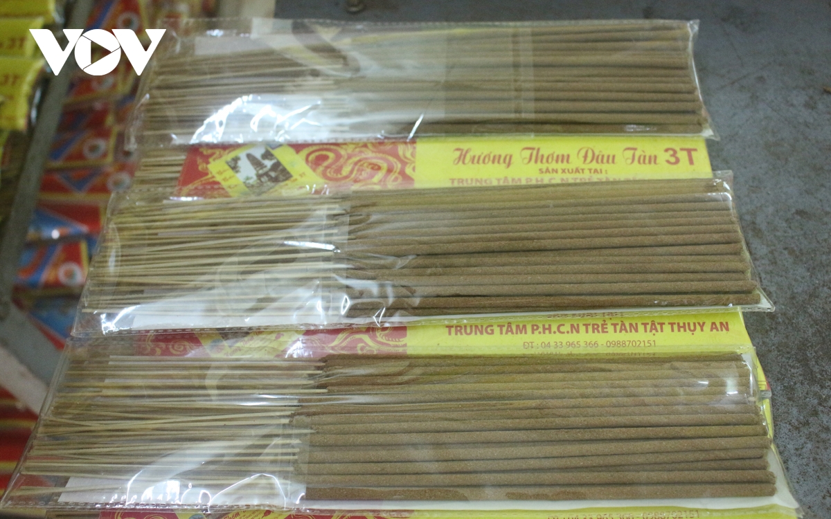 Hằng ngày, bắt đầu từ 8 giờ sáng, tiếng máy bắn hương lại hoạt động răm rắp. Bạn thì lấy nguyên liệu đổ vào máy, bạn thì cho tăm vào máy bắn hương để tạo ra thành phẩm. Thầy giáo là người cuối cùng kiểm tra thành phẩm, sắp xếp lại và loại bỏ những cây hương chưa đạt chất lượng. Buổi chiều là lớp đóng gói sản phẩm, công đoạn này dành cho những bạn khuyết tật nặng hơn, bởi không yêu cầu độ khó cao. Nếu nhìn bằng mắt thường chắc có lẽ chẳng ai nghĩ rằng đây là những con người bị khiếm khuyết, bởi cách các bạn phối hợp làm việc rất thuần thục, nhịp nhàng.
