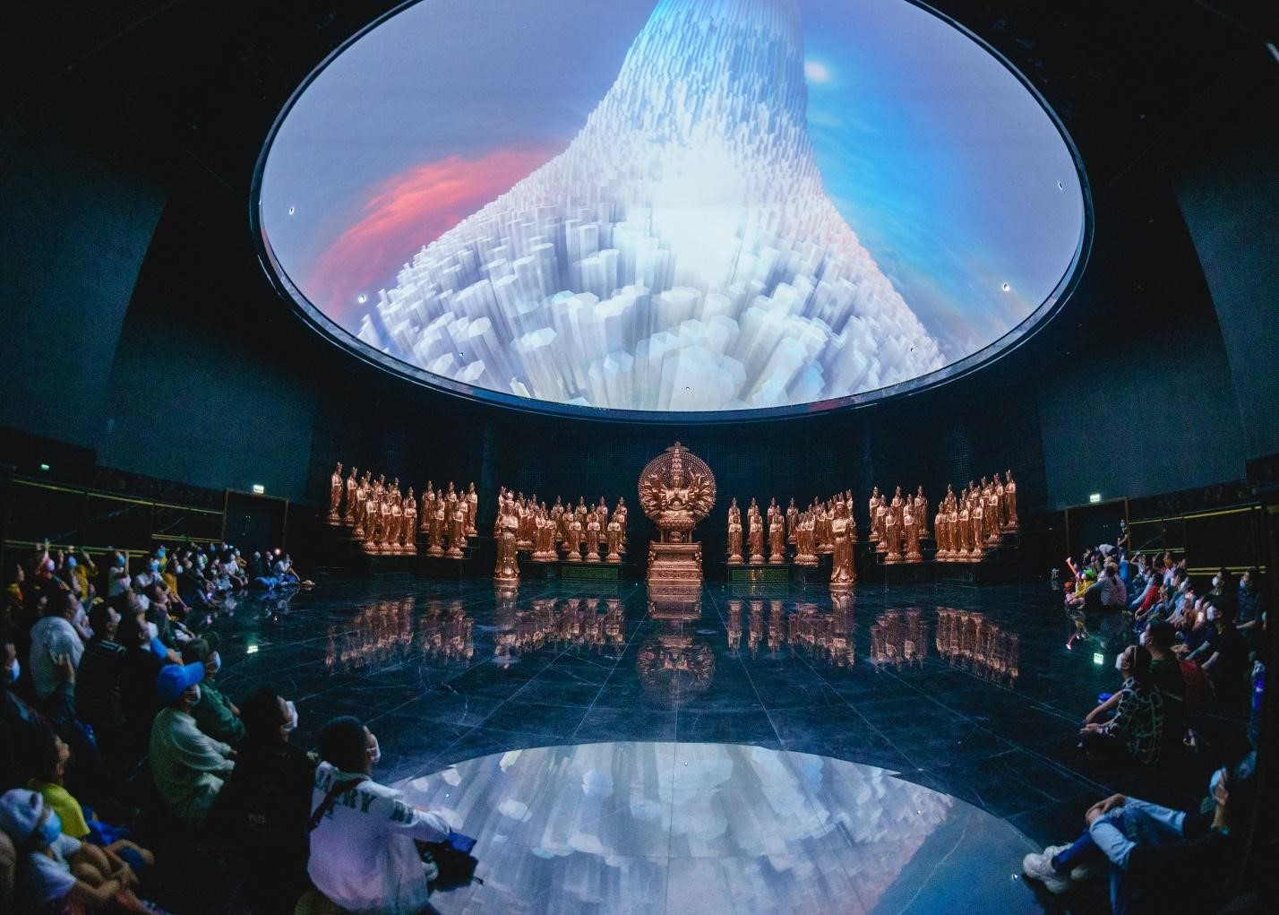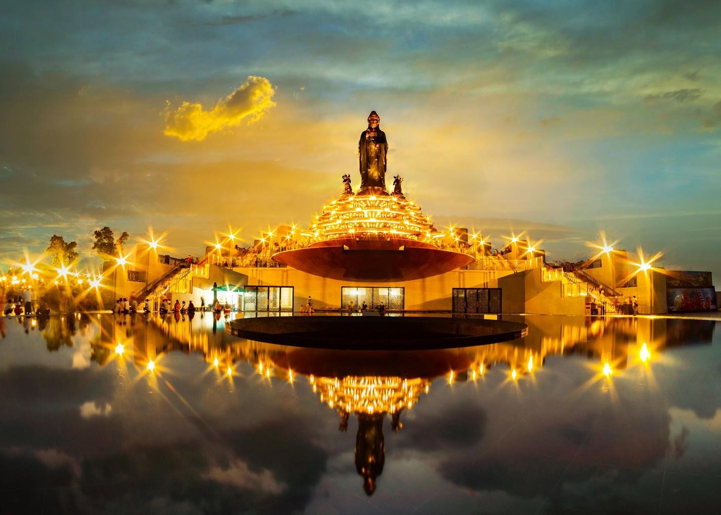 Điểm nhấn ấn tượng nhất với du khách Tết này là cụm công trình tâm linh gồm Tượng Phật Bà Tây Bổ Đà Sơn, hệ thống các đĩa nước trải dài từ chân tượng xuống khu vực bên dưới và khu trưng bày, triển lãm Phật giáo quy mô 4 tầng dưới chân tượng.