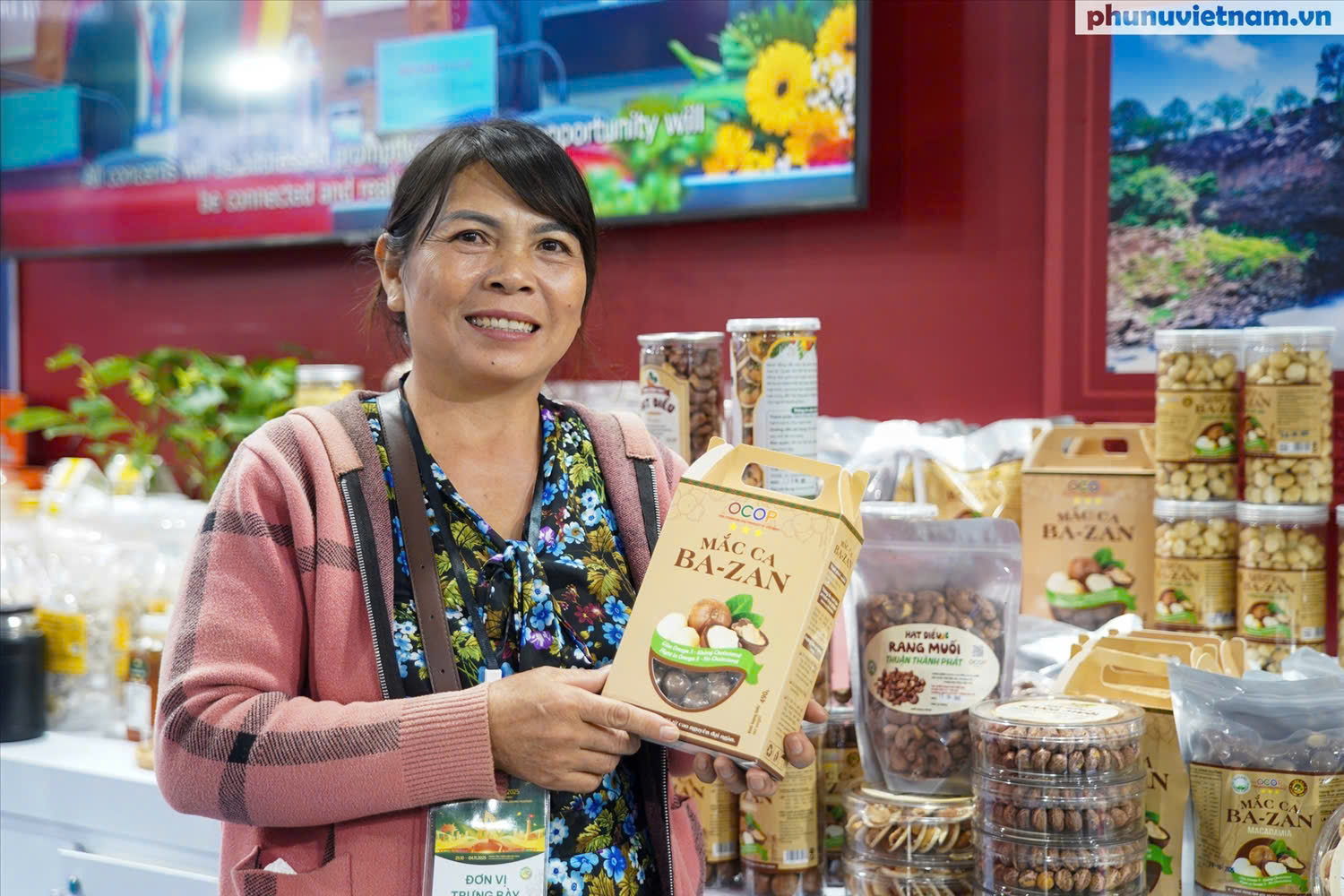 Bà Nguyễn Thị Bích, đại diện HTX Kon Hà Nừng, xã Đak Rong, Gia Lai giới thiệu dòng macca nguyên vị do đồng bào Ba Na trực tiếp trồng và chế biến. (Ảnh: MH)