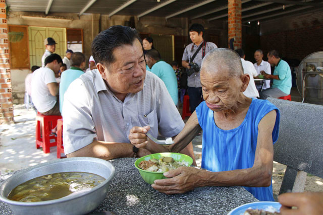 | Ông Trần Châu ân cần thăm hỏi sức khỏe các cụ già vào những bữa ăn để điều chỉnh, bảo đảm dinh dưỡng phù hợp với người già. |