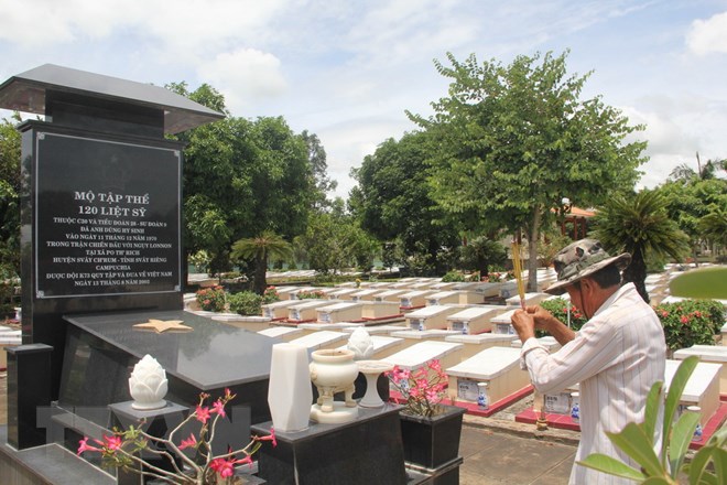 Trong số ấy, hài cốt của 120 liệt sỹ hy sinh tại xã Po Th’Rich, huyện Svay Ch’Rum, tỉnh Svay Riêng, được xếp chung trong chiếc quách lớn và phủ lên lá cờ đỏ sao vàng. Sau khi bàn bạc, thống nhất, hài cốt của 120 liệt sỹ an táng chung trong một ngôi mộ, đặt trang trọng tại vị trí đẹp nhất trong khuôn viên nghĩa trang. Từ đó, ngôi mộ tập thể của các liệt sỹ quân tình nguyện Việt Nam được ông Thương chăm sóc, hương khói cẩn thận, các tổ chức, đoàn thể khi đến thăm viếng nghĩa trang cũng ghé lại thắp hương nơi các anh yên nghỉ.