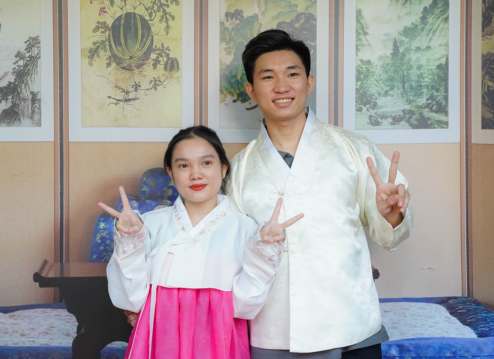 Các bạn trẻ mang Hanbok, trang phục truyền thống của người dân Hàn Quốc.