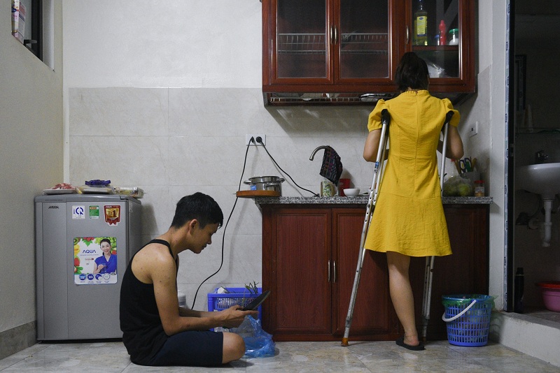 Thu hay đùa mỗi tối đi làm về, cô và chồng đều tháo chân giả để chung ở góc nhà, nhảy lò cò khắp nơi như đôi chim chích. Cả hai đều là người vui vẻ, hay pha trò trêu nhau, nên căn phòng nhỏ khi nào cũng rộn vang tiếng cười.