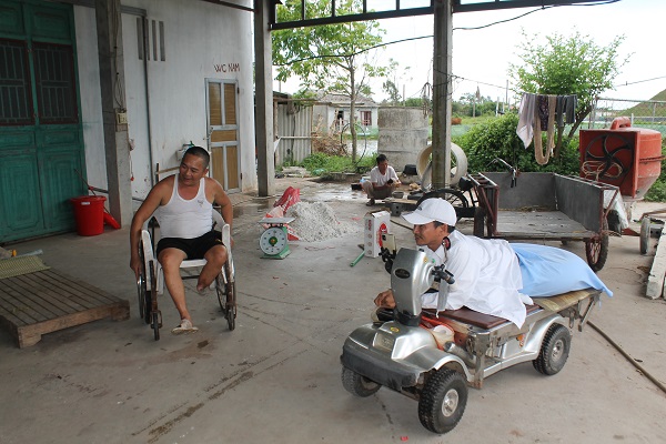 Ông Đinh Văn Phượng nằm trên chiếc xe lăn điện chuẩn bị bước vào ngày làm việc mới.