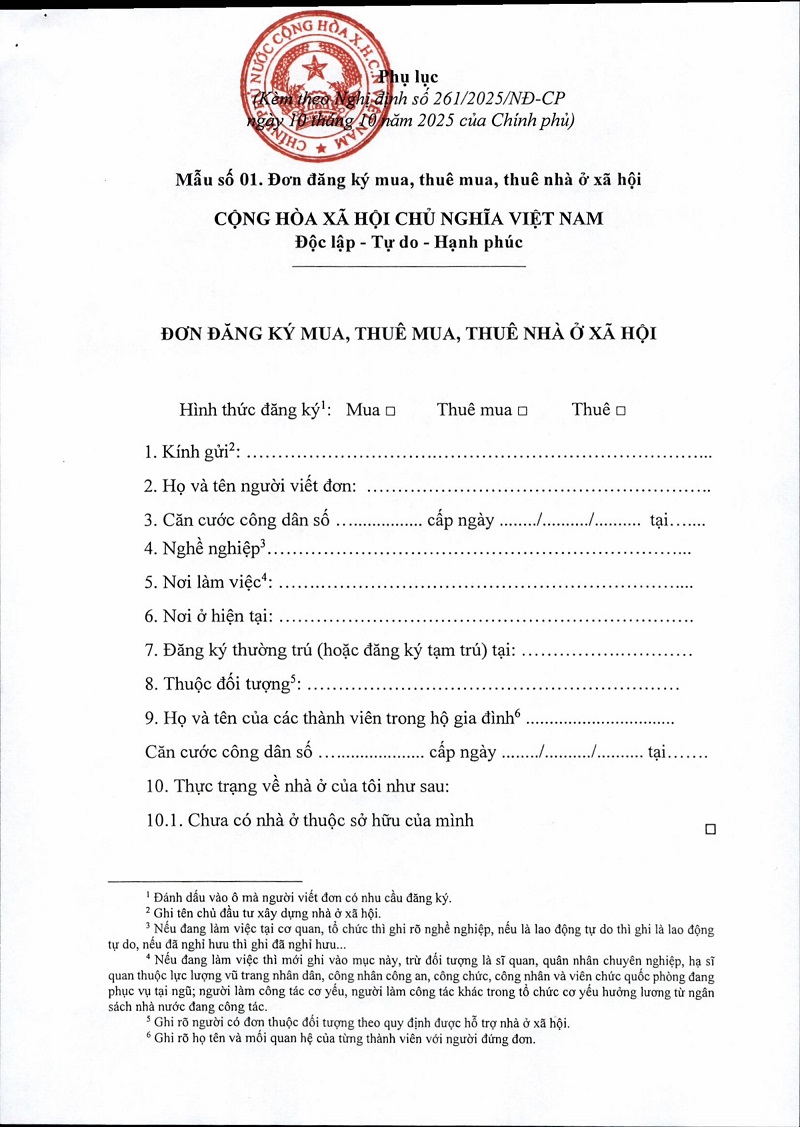 Kèm theo Nghị định số 261/2025/NĐ-CP phụ lục: Mẫu số 01. Đơn đăng ký mua, thuê mua, thuê nhà ở xã hội. Cụ thể: