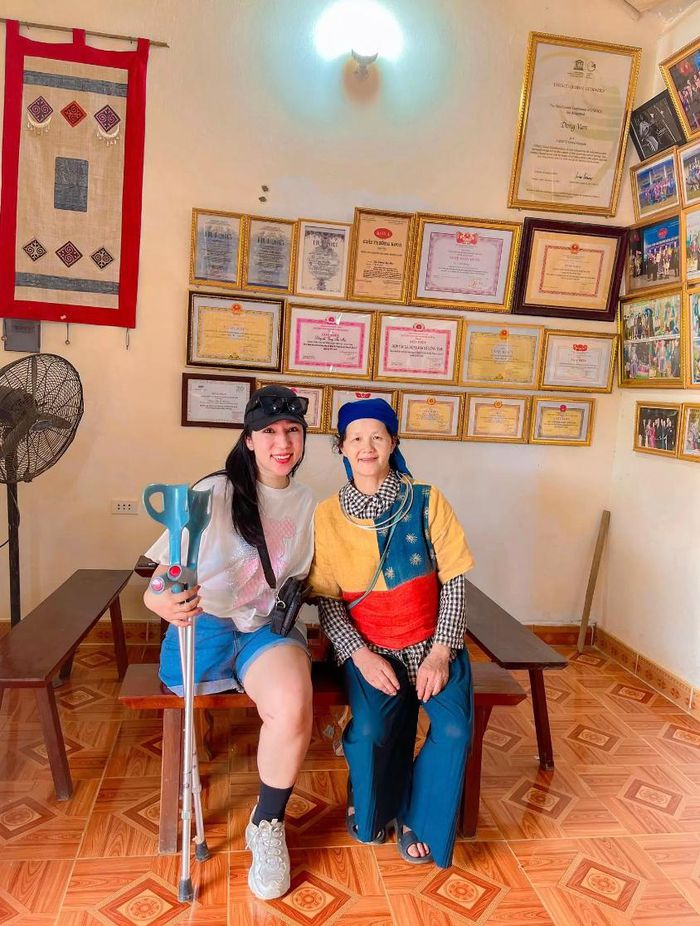 Chị Nga chụp ảnh kỉ niệm cùng bà Mai - một nghệ nhân ở làng dệt Lùng Tám.