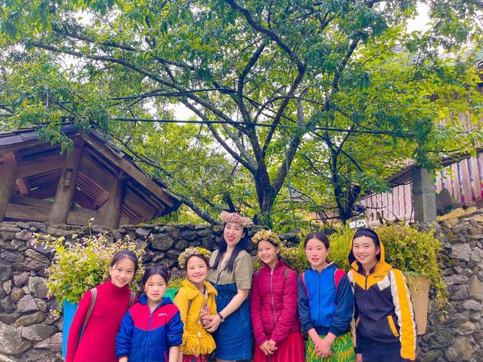 Chị Nga chụp ảnh bên những cô bé người Mông xinh đẹp.