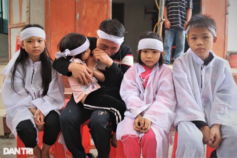 Thời điểm chị Hồng qua đời, anh Dũng không về kịp, 4 con thơ còn quá nhỏ nên phải nhờ người thân, xóm làng lo hậu sự. Trong căn nhà cấp 4 nằm cuối ngõ, 4 đứa trẻ đầu quấn khăn tang, tay cầm nén nhang thắp lên bàn thờ mẹ. Dường như 4 đứa trẻ vẫn chưa hình dung được khó khăn, vất vả mà chúng sẽ phải đối mặt sau khi mẹ qua đời.