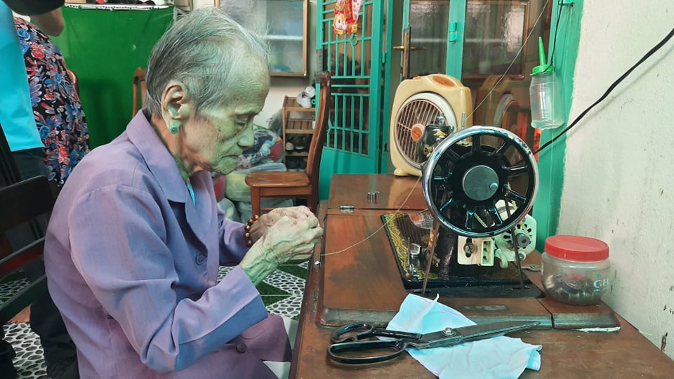 Điều gây xúc động cho bất cứ ai chứng kiến là hình ảnh bà cụ gầy gò, lưng đã còng nhưng đôi tay vẫn đang cần mẫn cắt từng mảnh vải nhỏ để may khẩu trang. Ở 97 tuổi, nhưng trông Mẹ vẫn còn rất minh mẫn.