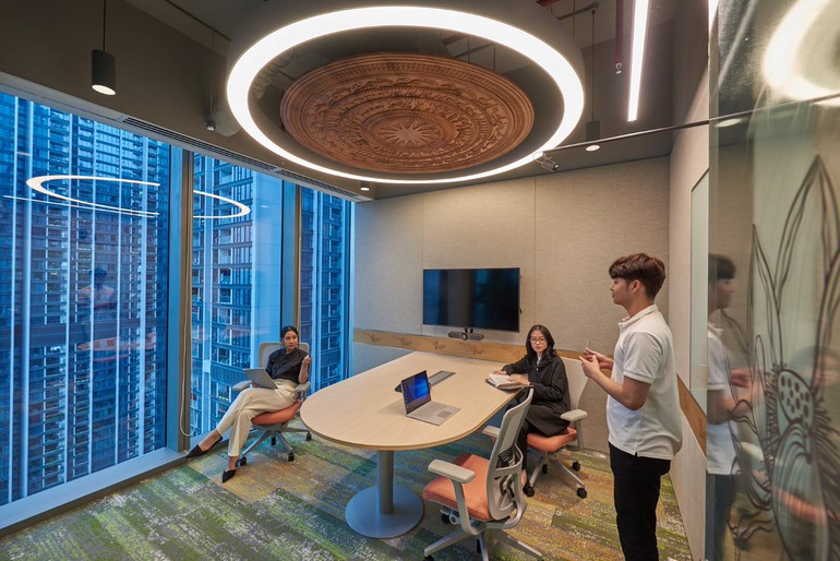 Được đánh giá là một trong những văn phòng làm việc hiện đại và thông minh nhất của Microsoft trên toàn cầu, văn phòng mới của Microsoft tại Hà Nội được kế theo mô hình "hybrid work" với phong cách mở và linh hoạt, tạo điều kiện cho nhân viên kết nối và cộng tác tối đa mọi lúc mọi nơi. Các phòng họp được trang bị đầy đủ các thiết bị tích hợp sẵn Microsoft Teams để hỗ trợ các cuộc họp kết hợp trực tiếp và trực tuyến, từ màn hình LCD, bảng trắng điện tử, bảng trắng thường, camera, hệ thống âm thanh chất lượng cao, để mang lại những trải nghiệm chân thực nhất cho người họp.