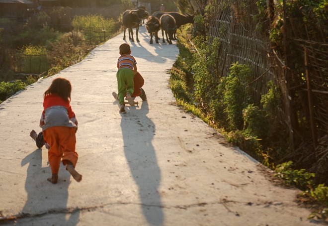 Những đứa trẻ chơi trò đẩy xe lúc chiều muộn.