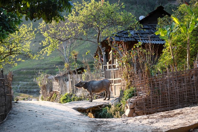 Một con trâu đứng đợi chủ về mở cửa vào nhà ở bản Nà Sảng.