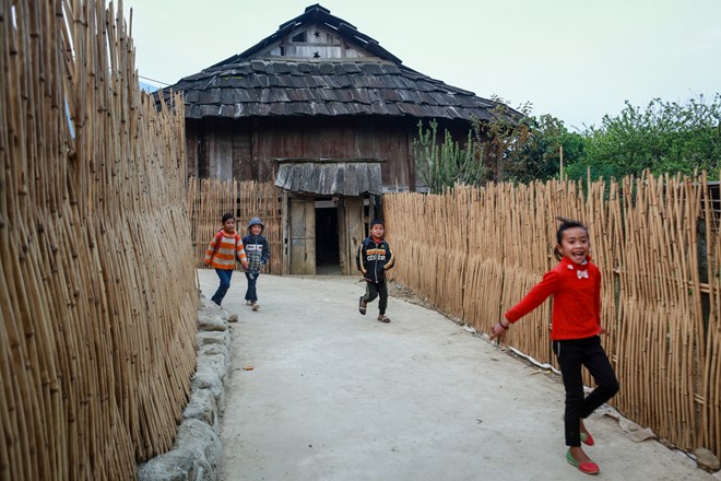 Trẻ con ở bản đi học qua những cánh cổng làm bằng gỗ pơmu, tường rào làm bằng tre độc đáo.