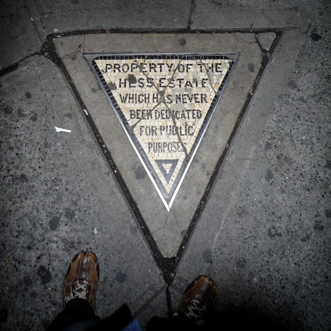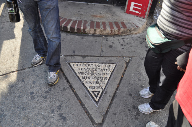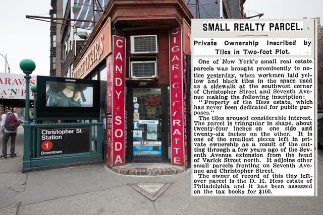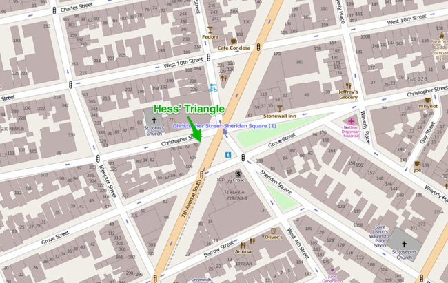Nằm ở góc phía Tây Nam của phố Christopher và đại lộ thứ 7, ngay trước cửa hàng Village Cigars là một miếng đất nhỏ hình tam giác có khắc dòng chữ "Miếng đất này là tài sản của Hess và nó chưa bao giờ được quyên tặng cho mục đích công cộng".