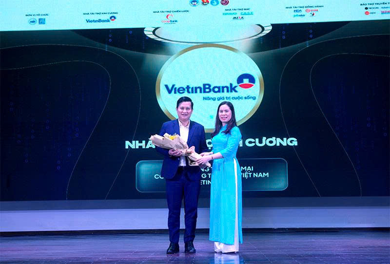 TS. Nguyễn Thị Bạch Tuyết - Trưởng khoa Hệ thống thông tin quản lý tặng hoa và cảm ơn ông Trần Công Quỳnh Lân - Phó Tổng giám đốc Ngân hàng TMCP Công thương Việt Nam Vietinbank.