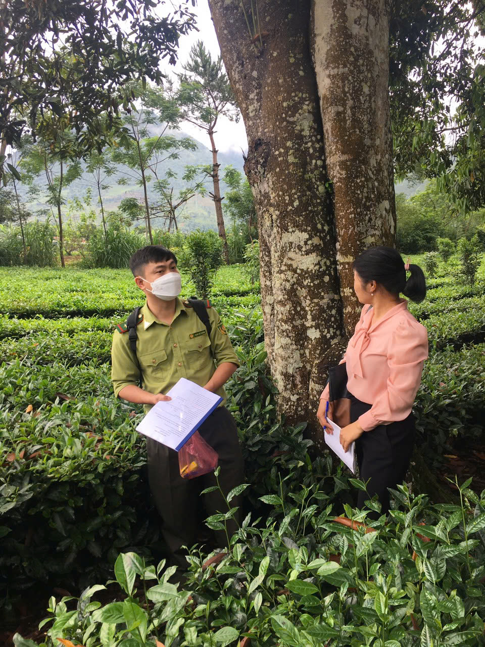 Cán bộ Kiểm lâm đi kiểm tra và đánh giá cây quế giống trội.