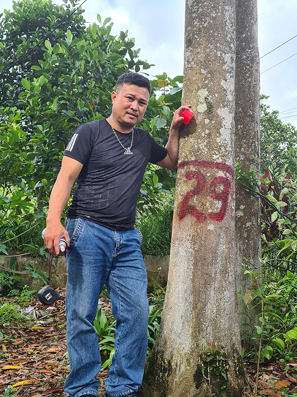 Ông Nguyễn Ngọc Tú, Chủ tịch HĐQT HTX Nông nghiệp Hữu cơ Suối Voi đi kiểm tra và đánh dấu cây quế giống trội.