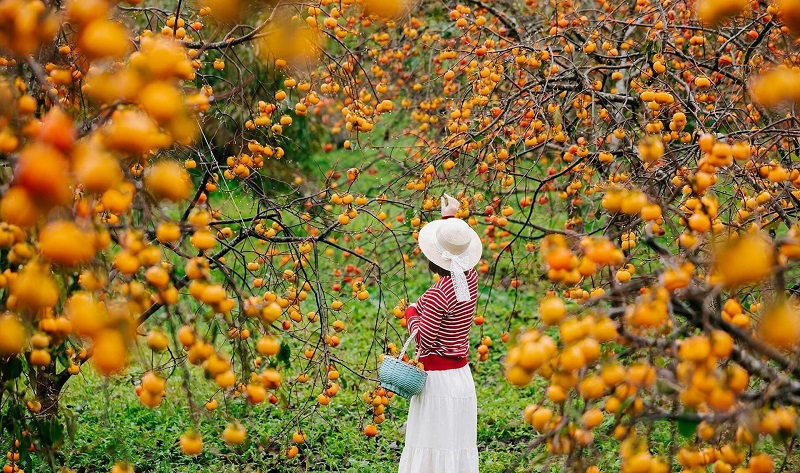 Trên những triền đồi, núi đá, từng cây hồng trụi lá, chỉ còn lại vô vàn quả tròn căng mọng, vàng cam lấp lánh dưới nắng chiều hoàng hôn. Cảnh sắc ấy vừa mộc mạc, vừa lạ lẫm, gợi nhớ tới bản làng yên bình nhưng lại khiến người ta mê mẩn như đang lạc giữa một bức tranh mùa thu của đất nước mặt trời mọc.