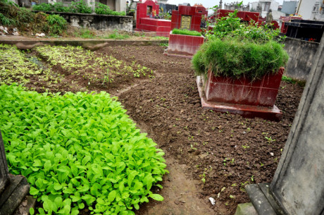 Bên cạnh những luống rau tươi tốt trên các phần mộ khô (mộ đã hỏa táng), thì nhiều phần đất cạnh các nấm mộ mới được chôn cất, vòng hoa còn chưa cũ đã thấy những ngọn rau muộng đua ngọn non mơn mởn. Những bó rau muống trồng ở đây sẽ được đưa tới người tiêu dùng trong nay mai?