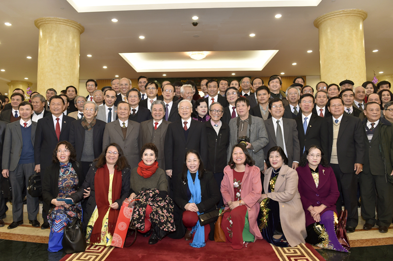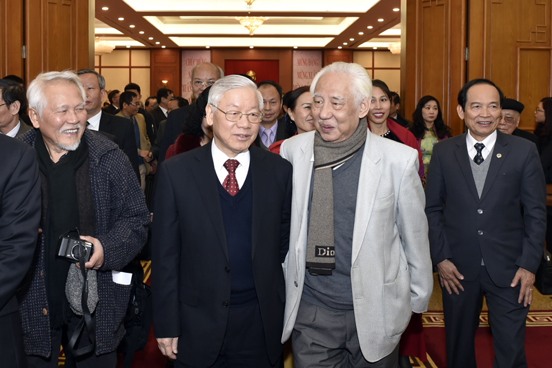 | Tổng Bí thư Nguyễn Phú Trọng gặp mặt các trí thức, văn nghệ sĩ. Ảnh: VGP/Nhật Bắc |