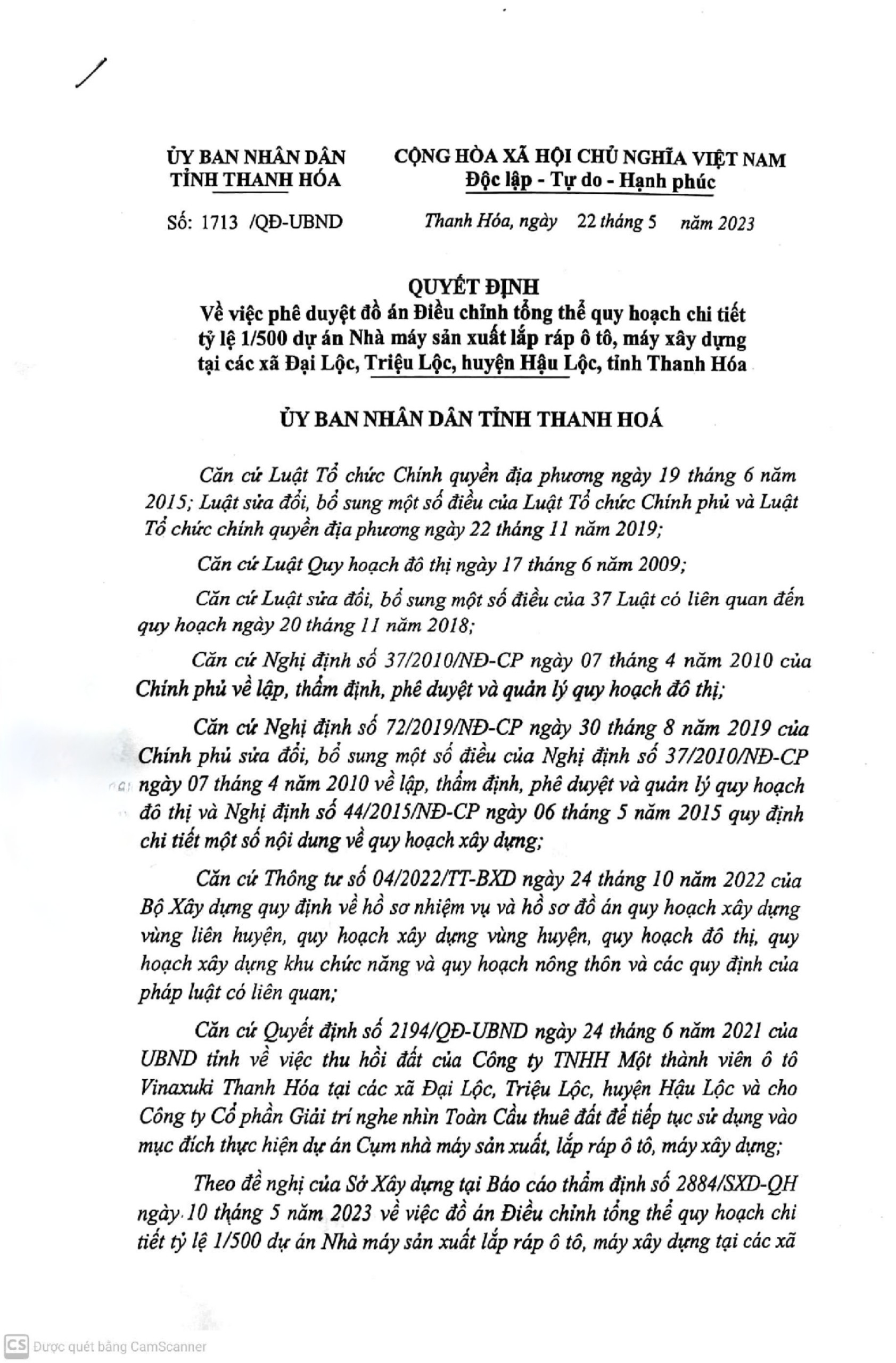 Quyết định số 1713/QĐ-UBND về việc phê duyệt đồ án Điều chỉnh tổng thể quy hoạch chi tiết 1/500 Dự án Nhà máy sản xuất, lắp ráp ô tô, máy xây dựng tại các xã Đại Lộc, Triệu Lộc, huyện Hậu Lộc, tỉnh Thanh Hóa.