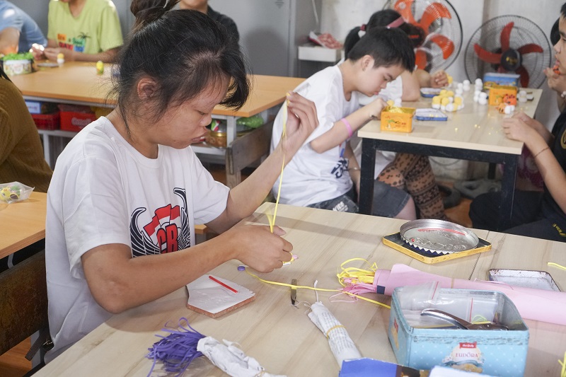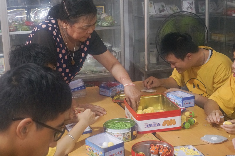 Trước đây, trung tâm có lúc dạy học đến 20 nghề, nhưng nghề phù hợp với người khuyết tật hiện nay là nghề thủ công giấy cuộn, làm các bức tranh, bưu thiếp, hộp trang sức… Với các mặt hàng đã kinh doanh lâu dài, học viên nào làm thành thạo sẽ đảm nhiệm việc hướng dẫn cho các bạn mới vào. Còn với những sản phẩm mới hay được đặt hàng theo yêu cầu, chị Quỳnh - con gái cô Hoa sẽ nghiên cứu trước cách làm sau đó mới dạy lại cho các bạn. Tưởng chừng như đơn giản nhưng thực tế việc dạy nghề cho người khuyết tật lại khó khăn hơn rất nhiều. Có những học viên tiếp thu nhanh, chỉ 1-2 tháng hoặc nhiều nhất 6 tháng là học được nghề. Nhưng cũng có bạn qua hơn 3 năm vẫn chưa thành thạo một thao tác của sản phẩm thủ công. Vì vậy, để đảm bảo chất lượng sản phẩm đầu ra, chỉ có một số ít người được làm việc độc lập, các học viên khác sẽ đảm nhận một khâu nhỏ trong quá trình và truyền tay nhau để cùng tạo nên sản phẩm.
