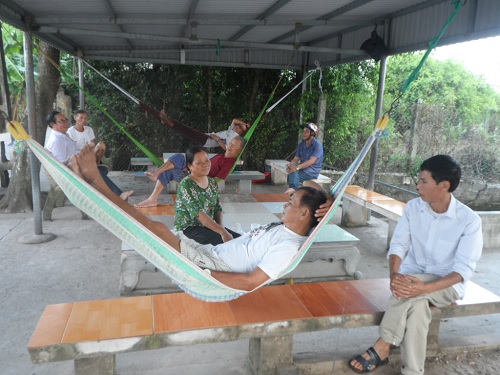 | Phút nghỉ ngơi, trò chuyện của lãnh đạo xóm cùng người cao tuổi tại câu lạc bộ - sân văn hóa xóm 29, thôn Đồng Lư. |
