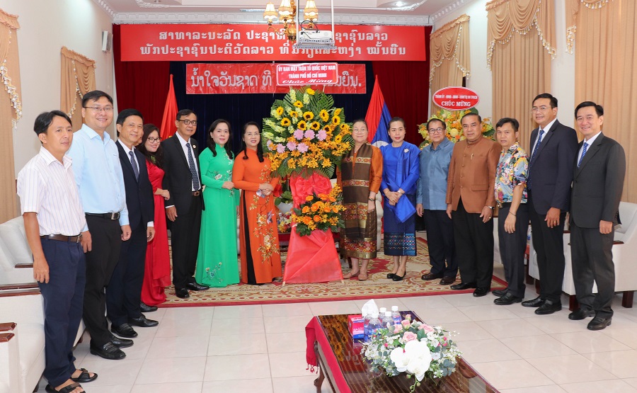 Đoàn đại biểu TP Hồ Chí Minh chụp ảnh lưu niệm cùng Cán bộ, nhân viên Tổng lãnh sự Cộng Hòa Dân Chủ Nhân Dân Lào tại TP Hồ Chí Minh.